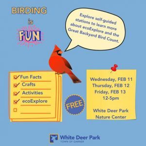Stop by the nature center classroom to learn more about birds and the Great Backyard Bird Count! Explore self-guided stations to ...